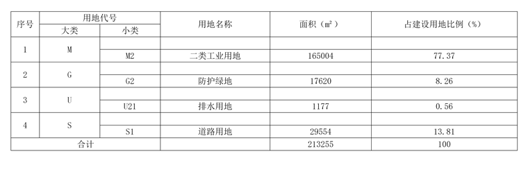 规划总用地面积为21.3255公顷,其中二类工业用地面积16.5004公顷,防护绿地用地面积1.7620公顷,排水用地面积0.1177公顷,城市道路用地面积2.9454公顷。二类工业用地容积率≥0.7,建筑密度≥30%,绿地率≤20%,建筑限高≤24米;排水用地容积率0.3-1.0,绿地率≥30%,建筑限高≤24米;规划防护绿地率≥75%。